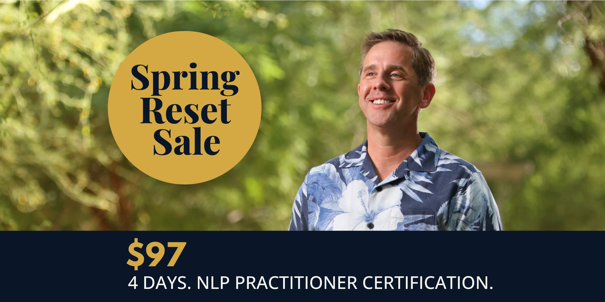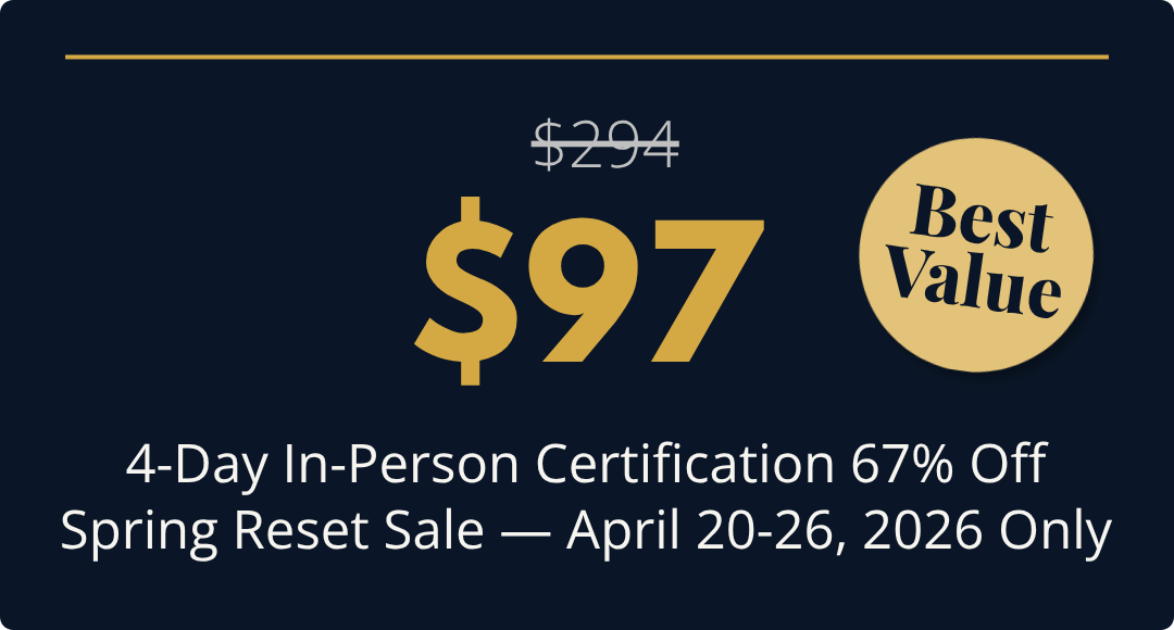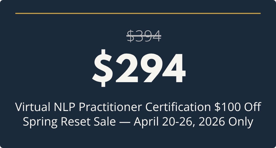 The $97 Spring Reset Sale price for in-person NLP Practitioner Certification is a limited-time promotional rate available April 20-26, 2026 only. This rate cannot be combined with referral codes, partner discounts, or any other promotional offers. This rate is for new registrations only. Previously purchased tickets at the regular price of $294 are not eligible for a retroactive price adjustment or refund of the difference. No exceptions. All sales final.